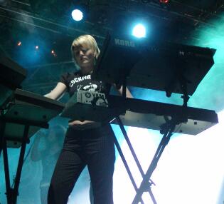 Strobes cut out of the dark the shadow of Sister Bliss playing her