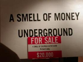 "In 1998 the Bristol City Council decided to honour Bristol's son Richard Long by buying a piece for a local museum. A local magazine wanted me to interview Long or do a piece about him, but he didn't want to be interviewed, anyway not by a pop star. I decided to go to Bristol for some reason. I went there and came back home at night. My wife was sleeping, the children were sleeping and I went to my bedroom and looked at the Richard Long. I took it down to the kitchen and it was only then that I wondered why I had bought it, it meant nothing, it was just a piece of paper in a frame. I was aware that I had never looked at it. It was 1995 when I got it and now it was 1998, and everyday I got up in the morning, rushed away and never looked at it. That night I decided to get rid of it and sell it at $20,000. I was aware that the cost of the piece would have risen by then, but I liked the sound of it, it sounded sexy, it wasn't $17,000 nor $32,000, but $20,000. I wrote this in a story and send it to a magazine and they said they would have published it and would have liked to do a small exhibition to sell the work I had. I thought it would have been good, so I prepared for it buying these placards." Drummond shows his audience the red and white placards, "500 indestructible placards that said 'FOR SALE - A Smell of Sulphur in the Wind - Richard Long - $20,000' No address, no nothing. I just liked the idea that 99% of the population would have just seen the 'FOR SALE' placard and maybe somebody would have wondered why whatever was sold was sold in dollars. I got things ready for the Bristol exhibition and I also put one placard in a frame that was exactly the same size as my 'A Smell of Sulphur in the Wind'," Drummond shows the framed placard, "and I did another placard on which there was written 'A Smell of Money Underground'," Drummond shows the huge placard, "I decided that once I had sold the Richard Long at $20,000, I would put the money in a wooden box, get to Iceland, get to the stone circle where the Long thing was done, dig in the middle of the circle and bury the box. I would then take a picture, finish the walk my sister and I had started, go back home, print the picture in the same size as my Richard Long and hang it on my bedroom wall. We prepared the exhibition with the original Long piece, my text pieces and so on, all had been arranged and everything was ready, but I decided not to sell the picture. I had got 'A Walk Across England, a book by Richard Long, which had recently come out, a book commissioned by an American university about a walk from Devon to Suffolk he had done. I decided to do a journey starting in Southampton and crossing Scotland. Along the journey I would have tried to sell the piece. While on my journey I left the 500 placards along the motorway and took pictures of the placards on the various sites. I stopped every now and then to see if anybody would buy the Richard Long. Then put it again in my Land Rover and leave again."