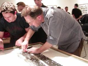 "The most strained thing that happened to me on my journey was when I was talking in the café with the workers who had just finished their shift, it was not a strange thing for me, but it was strained. You know, I could deal with people who come from an art background, I could deal even with a woman who was confronting me in Bristol about the whole thing, suggesting what should have been done with the money, but I found most hard to deal with the women who had just come off their shift. Their whole lives are grinding." The night before Drummond has read some extracts of his How To Be An Artist describing his journey from Hull, where he exhibited to his audience another of his gadgets, a huge 'For Sale' carpet, to Glasgow. Depleted and tired, after arriving in Scotland to conclude his journey, Drummond looks at his Richard Long and decides to take some pictures of it with his kids' camera. While taking his pictures, Drummond suddenly realises there are some measures and dates written on the back of the Richard Long piece: 1994, photograph and text work, 32"X44", 81X104cm. During the night Drummond has the final idea, cutting up the work in twenty thousand pieces and selling them at $1 each. And that's what he's been doing touring around Great Britain, he's simply trying to sell pieces of his once beloved Richard Long to his audience. "I don't know how many pieces I have sold, it might be 2000 pieces", he shrugs, "but, to be honest, I don't know if what I'm doing has got any other value other than being slightly amusing. I was in Bristol before coming to Glasgow and the thing went very well there. When the people come along to my event they may be entertained for a while, but maybe then they go home and forget, so what I'm dong might have no lasting impression. Besides, I'm getting very little out of all the amount of work I'm doing now." Last night's event in Glasgow was particularly good: a lot of people queued up with £1 pound coins to buy pieces of Long's artwork. Gimpo was ready to change their pounds in dollar banknotes, then he asked them to choose two numbers from two different bags: the numbers acted as the X and Y coordinates of the work of art. Buyers were finally allowed to go to a table were Drummond was ready to cut for them tiny pieces of art, following the coordinates people had fished out of Gimpo's bags. The buyers were later redirected to a big white placard on which thousands of little blank squares formed the word "SOLD" and they were asked to fill with different colours a little piece of white space corresponding to the exact space where their tiny piece of the Richard Long had been cut out from the original work of art. When all the squares will be filled, the word "SOLD" will finally come to life.