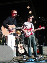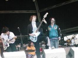 Mother & The Addicts, introduced by Stuart as the "new Glasgow darlings", manage to attract the audience's attention with some angry garage rock graced with synthesizers and samples. Currently on Chemikal Underground, this band that combines Dr Feelgood with the Velvet Underground and The Upsetters are at present working on their debut album, but seem to have already quite catchy hits such as "Serious Superstar" and "Oh Yeah You Look So Nice". They are followed by city rockers V-Twin, with frontman Jason Macphail looking like a cross-over between Bobbie Gillespie and Elvis. This afternoon they sound more like Screamadelica-era Primal Scream and less like Sun Ra. Sporting a colourful jacket adorned with tigers and with 'Okinawa' embroidered on the back (while one of the guitarist is wearing a sailor shirt that looks very Orange Juice - circa 1980), Jason sings "Pink Slip" and "If You Don't Touch Me, I'm Going to Have to Touch Myself", that sounds like Primal Scream's "Loaded" and "Medication" rolled into one. The band concludes with "Delinquency", for which I'm simply grateful.
