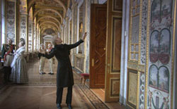 More than just a showcase for technique and technology, the film offers an active conversation about Russian history and culture, and especially about the love/hate relationship between Russia and Europe. The narrator (who we never see) is joined for his journey through the museum by a French Marquis (played by Russian theater actor Sergei Dreiden); the dialogue between the two brings out the differing perspectives Russians and Europeans have on the status, history and culture of Russia.