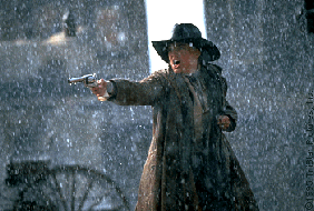 In what is fundamentally a picture built around a series of shoot-outs, Raimi keeps things fresh and exciting by filming each significant showdown in a different style. Raimi's wild approach also gives The Quick and the Dead an almost surreal quality: we get an unusual perspective shot through a huge bullet hole left in one gunslinger's head that seems almost cartoonish in nature. The bad guys are photographed at dramatically low angles as they chew up the scenery with their sneering, dirty looks and obvious contempt for anything decent. Pathetic fallacy also plays a large role in the film. When a fierce storm of Biblical proportions hits the town, sure enough something rotten is bound to happen. Of course this all seems like some sort of pat cliché, but there is a playful quality and chutzpah on Raimi's part to use every camera trick and technique in the book, that gives the film real charm and makes it worth watching.